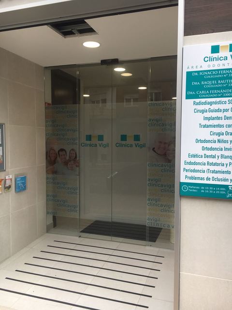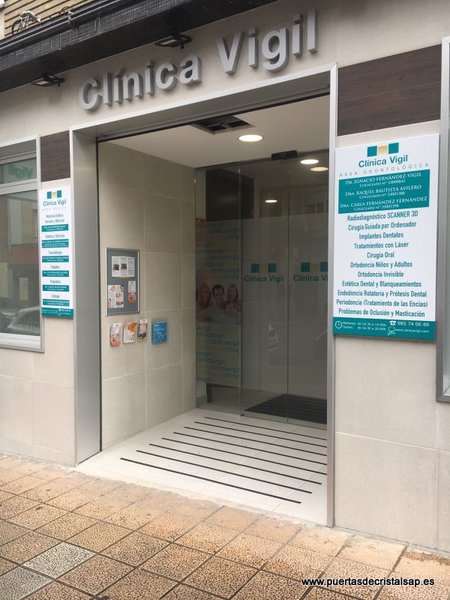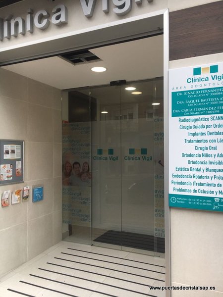 Puerta automática de cristal formada por dos hojas fijas y dos hojas móviles, consiguiendo un paso libre de 1400 mm que combinado con la rampa de acceso elimina cualquier tipo de barrera arquitectónica.